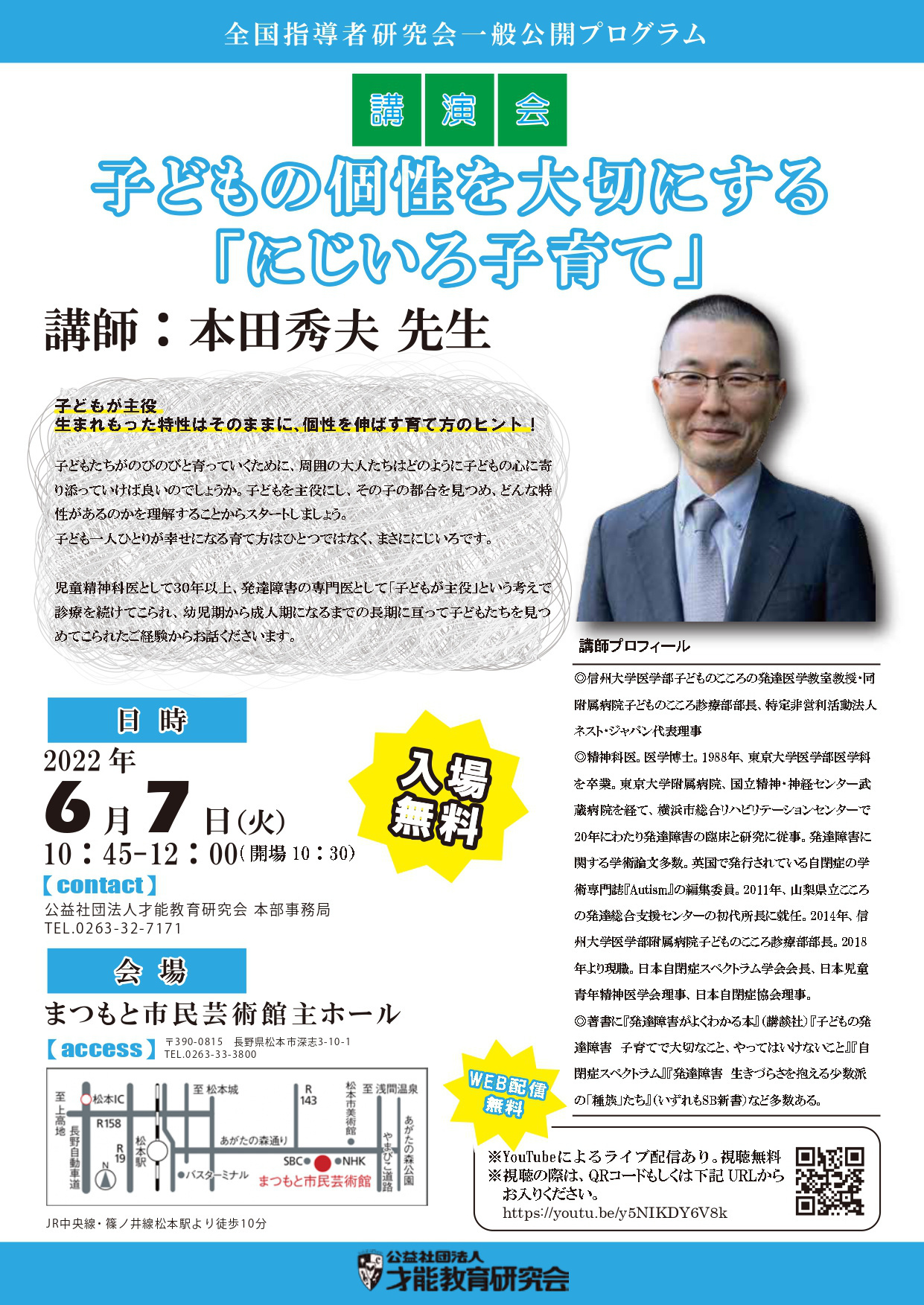 発達障害の専門医である本田秀夫先生の「子どもが主役」という考え方を、豊富な現場経験からお話をいただきます。子ども一人ひとりの育て方は一つではなく、にじいろであるというお考え、とても興味深い内容となります