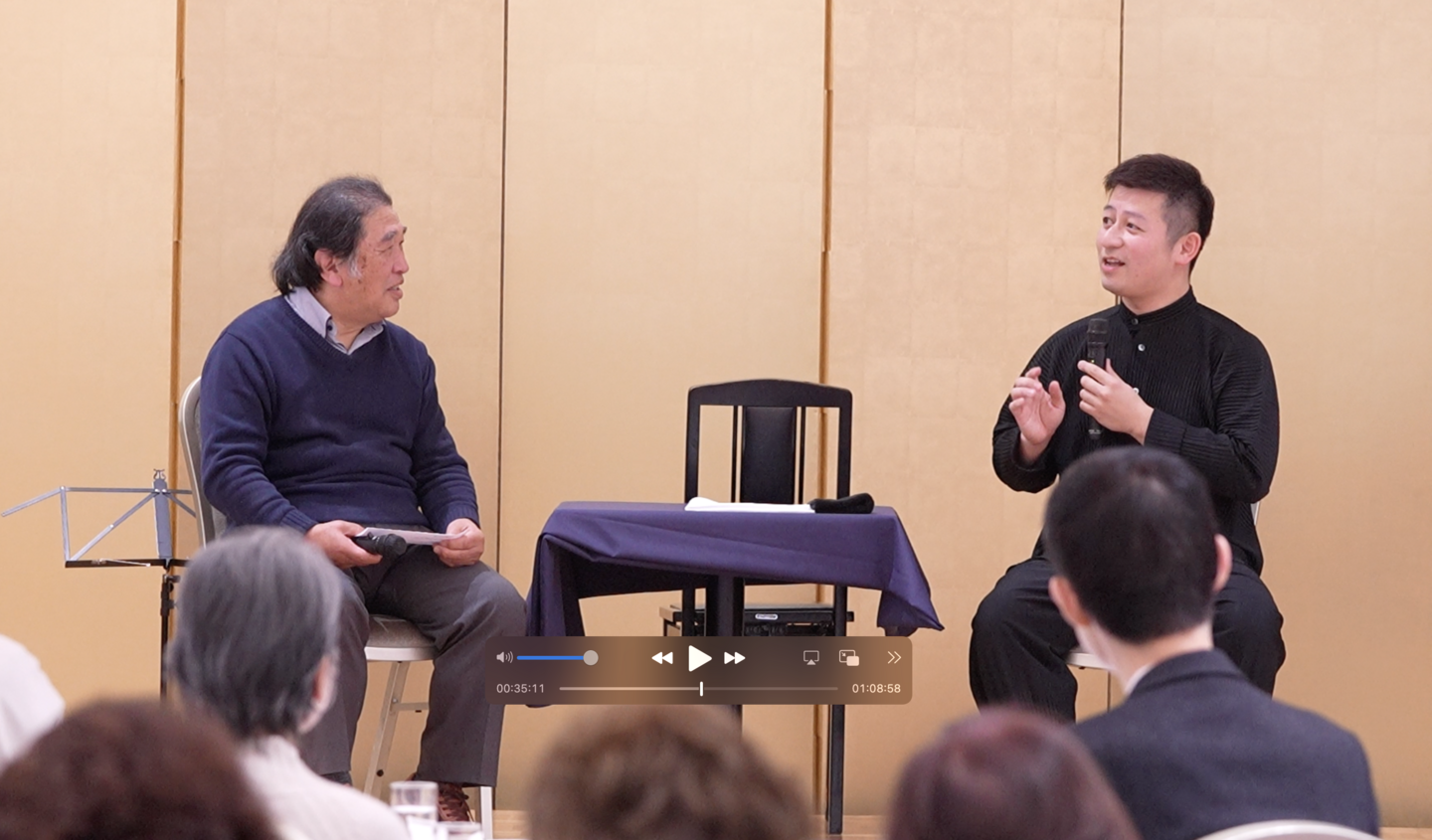 冒頭、川沼先生のお詫びから始まりました。なんでも、大さんが小さい頃に何かの拍子で川沼先生が大さんの腕を引っ張ったことがあったそうで、「その時のこと、本当にすみませんでした」とお詫びされ、会場の皆さんも大さんも大笑い。そして、2歳の頃には、先生たちの集まりで、隣の教室で遊んでいた大さんが、内側から鍵を間違ってかけてしまい、大騒ぎになった話が川沼先生から披露されました。大さんも「その頃ヴァイオリンを習っていましたが、チェロに移ったのも、落ち着きがなかったので座って練習するチェロに変えたくらいでした。その鍵の事件もきっとその影響ですね」とまたまた大笑い。「母と父がスズキの先生でしたので、いつも大人の皆さんと一緒にいましたし、一人っ子でしたから、仲間がたくさんいたのも嬉しかったことです」。「3歳の頃、リトルコンサートでリゴードンを弾いたビデオを見ると、チンパンジーみたいに父に舞台に連れてこられて、手や足をセットしてもらい、音楽が鳴ると自動で演奏するみたいな(笑)、懐かしいです。みんなの前で演奏できる楽しさがありましたね」。