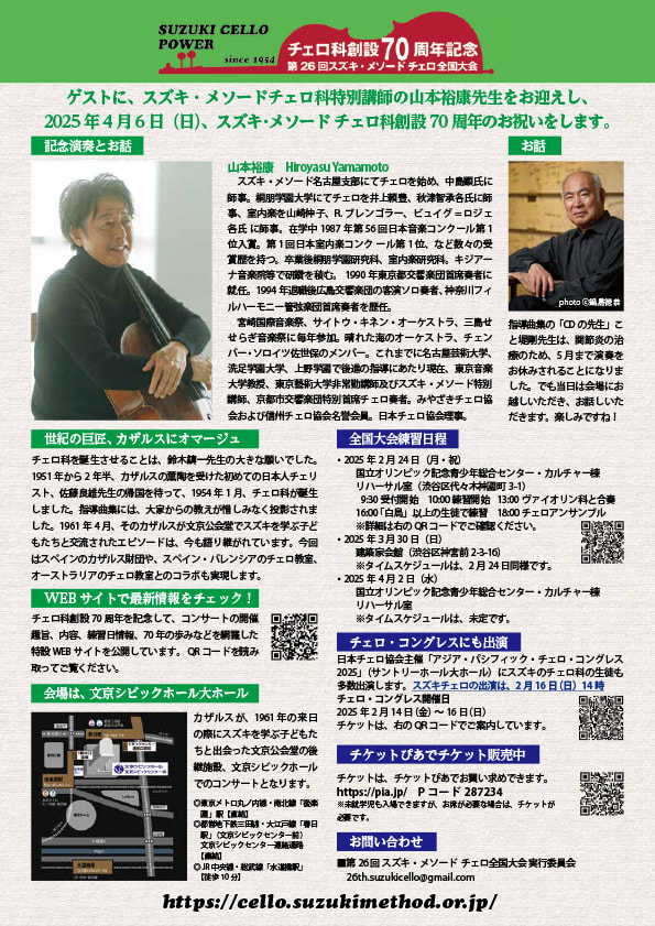 そこで、記念演奏は、チェロ科特別講師の山本裕康先生にお願いし、ご快諾をいただきました。曲目は、ラフマニノフのチェロ・ソナタより第3楽章、第4楽章です。この曲は、有名なピアノ協奏曲第2番の直後に作曲された作品で、ラフマニノフらしい抒情性に満ち溢れた作品です。楽しみですね。山本裕康先生の最新プロフィールは、チラシの裏面にあります。