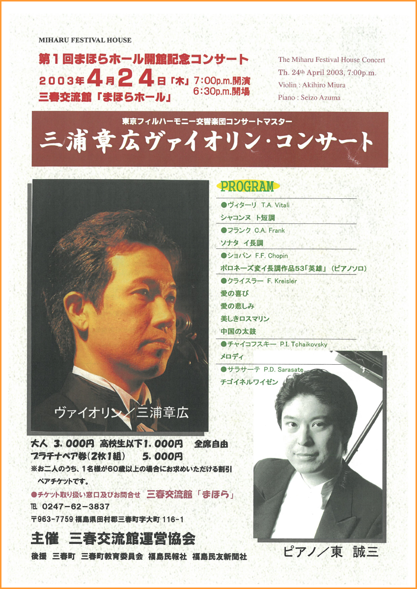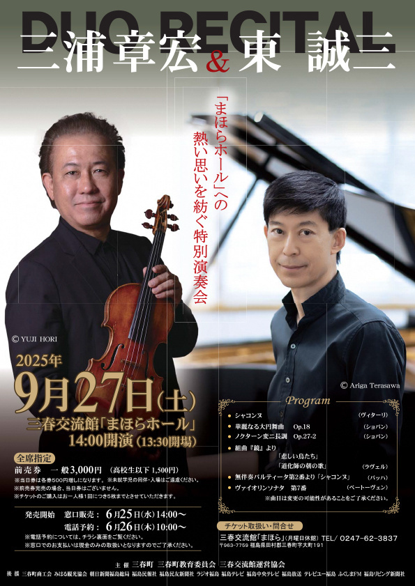三春の「まほらホール」に来てくださるようになって、ほぼ毎年演奏を聴かせていただいています。ここ数年、特に楽器とホールが一体化してきたような感じがして、音量、音色ともにとても素敵になり、ファンの方も増えました。東先生との共演はいつも素敵なプログラムで楽しみにしています。