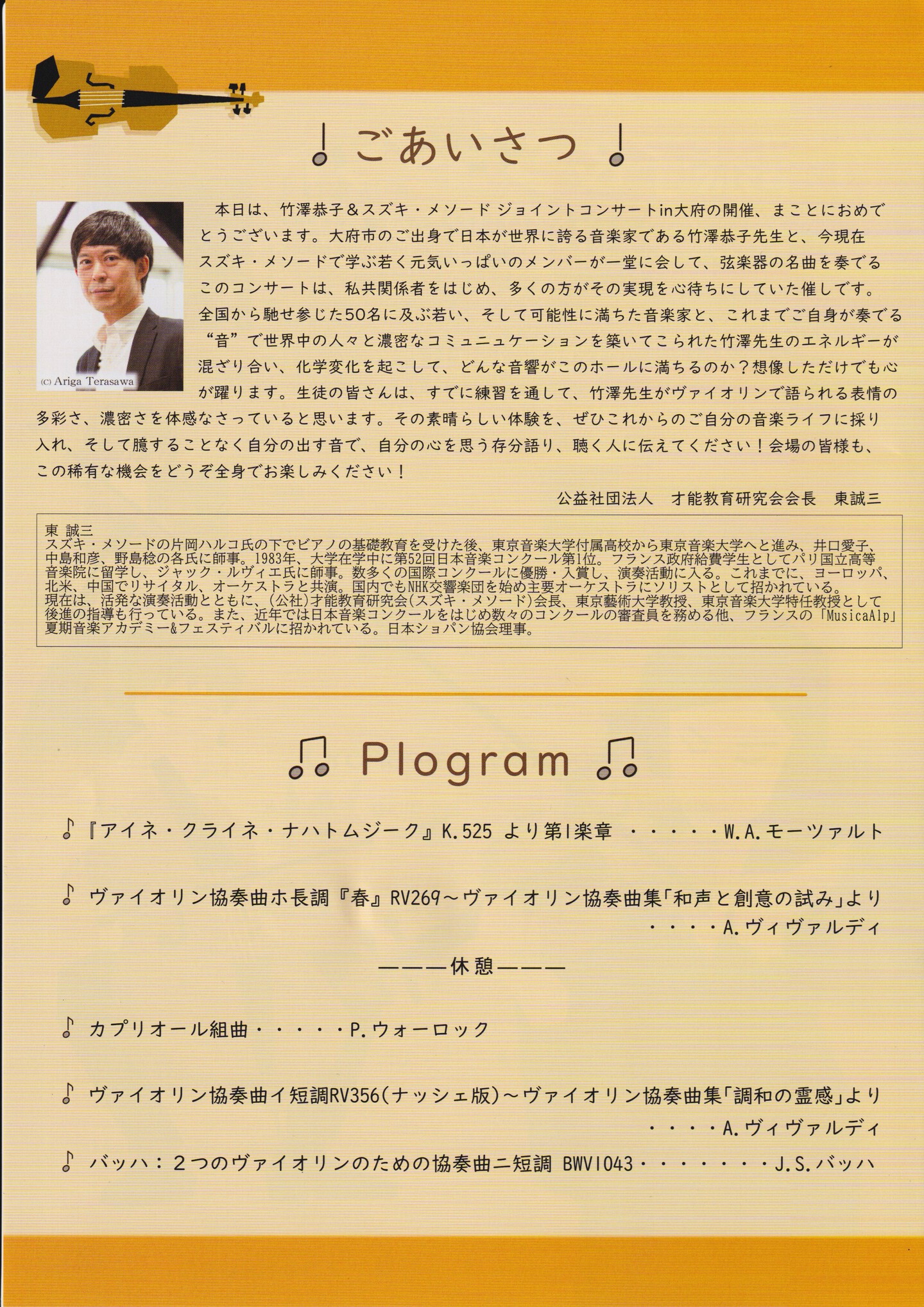皆さま、こんにちは。本日はこのコンサートにご来場いただき、誠にありがとうございます。公益社団法人才能教育研究会の理事を務めております、榊直樹でございます。本日の開催にあたり、大府市の岡村市長をはじめ、関係者の皆さまに心より御礼申し上げます。