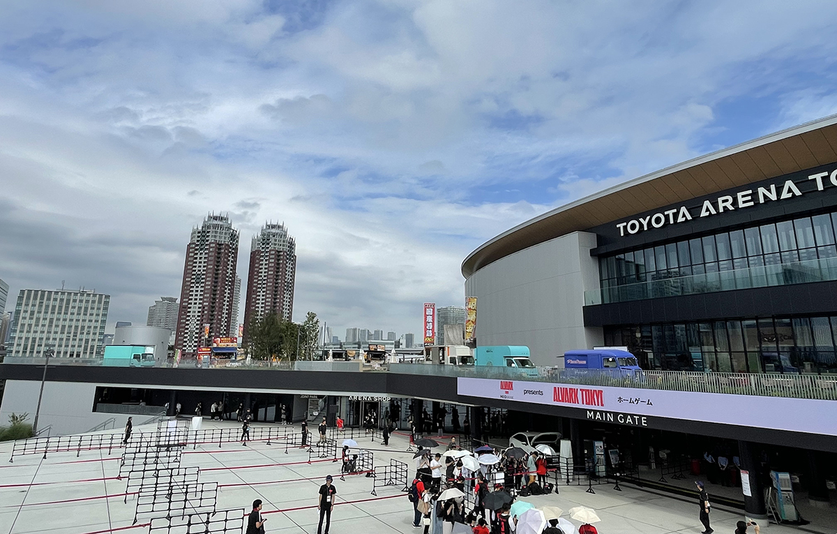 さて、いよいよアリーナ前。グラコンの映像担当や広報メンバーと合流。バスケの試合は夜ですが、2時間くらい前から会場に入れます。これ、気持ちも試合に向けてワクワクと盛り上がって、すごく良いシステムですね。
