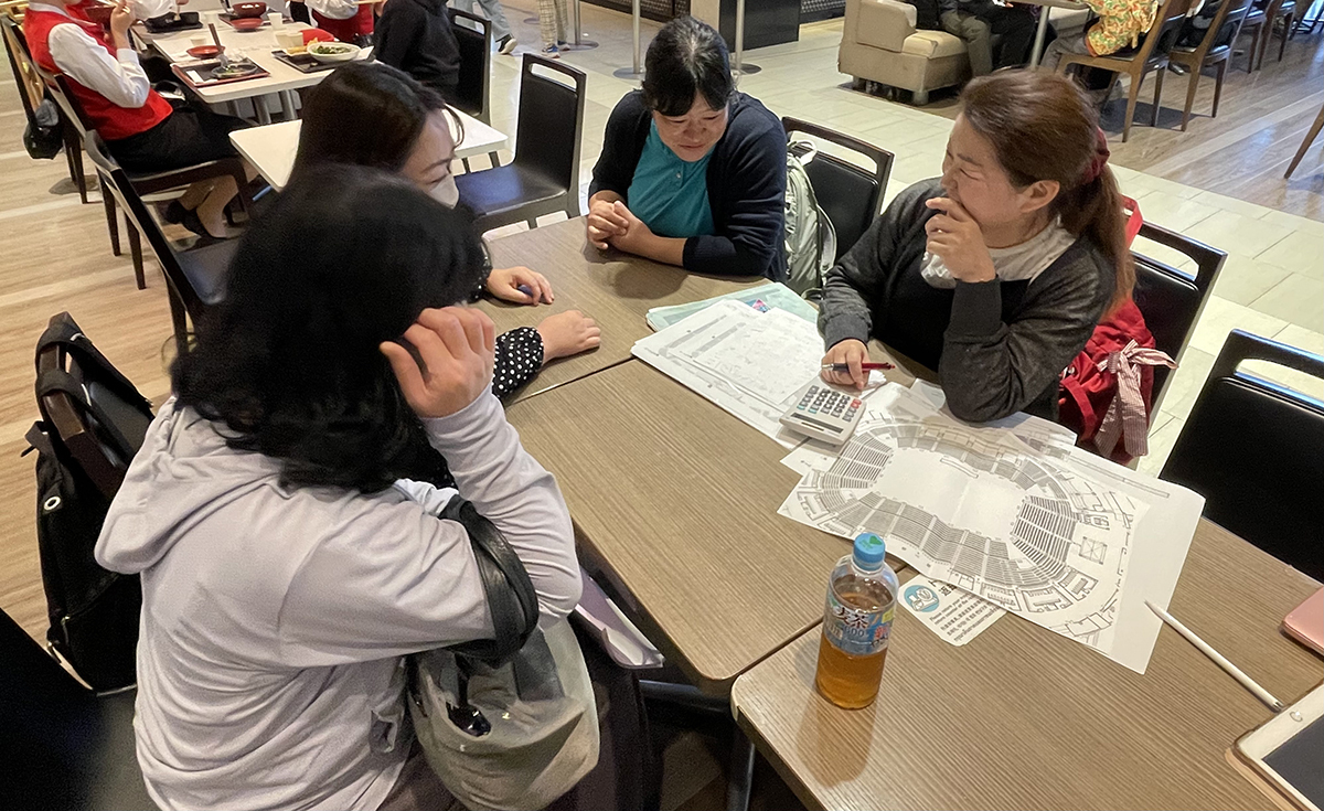 まずは空いている時間を狙って、お台場の「ダイバーシティ東京プラザ」のフードコートの片隅で遅めのランチをとりつつ作戦会議。生徒席の位置、生徒の動線、アリーナの体系図など作り上げていきます。2時間の白熱する会議の末、なんとか図面上は形にして、いざTOYOTA ARENA TOKYOへ。