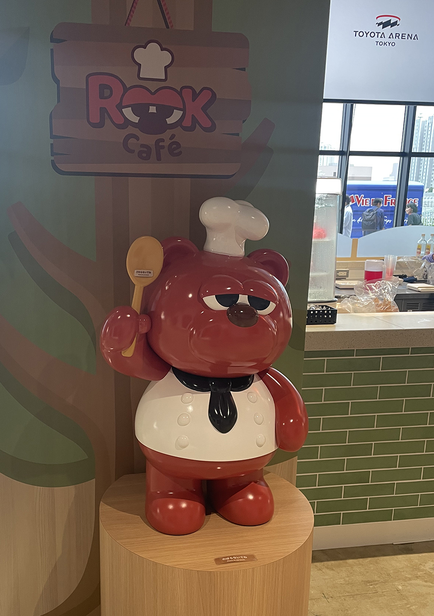 まずは、宮殿に向かうような大階段でメインゲートに向かいます(エレベーターでも行けますから、ベビーカーや車椅子の皆様も安心です)。外にも華やかで、とても見やすいヴィジョンが設置され、目を惹きますが、その脇のARENA SHOPに吸い寄せられます。マスコットキャラクターのルークは眠そうで、