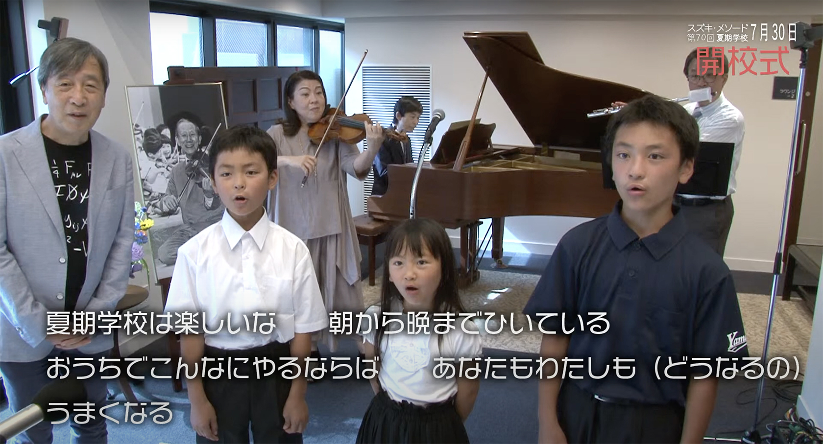 早野会長を始め、講師の先生方と末廣実行委員長からのご挨拶がありました。また、鈴木鎮一先生が作詞された夏期学校の歌を「楽しい朝」に合わせて、生演奏でお披露目。3人の子どもたちに元気よく歌いました。早野会長は「どうなるの?」のセリフを担当されました。