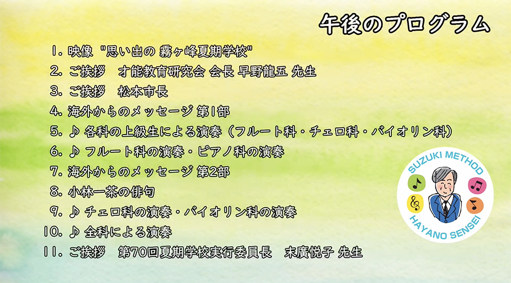 昼食後の「第70回夏期学校記念〜生徒のコンサート」では、1951〜1952年の霧ヶ峰で開催された初期の夏期学校などのお宝写真とエピソードの数々が次々に公開されました。そしてあらかじめ収録された生徒たちの演奏が続きました。間に阿部守一長野県知事、臥雲義尚松本市長、アレン・リーブ国際スズキ協会CEOなどからの70回を記念する祝福メッセージも紹介されました。