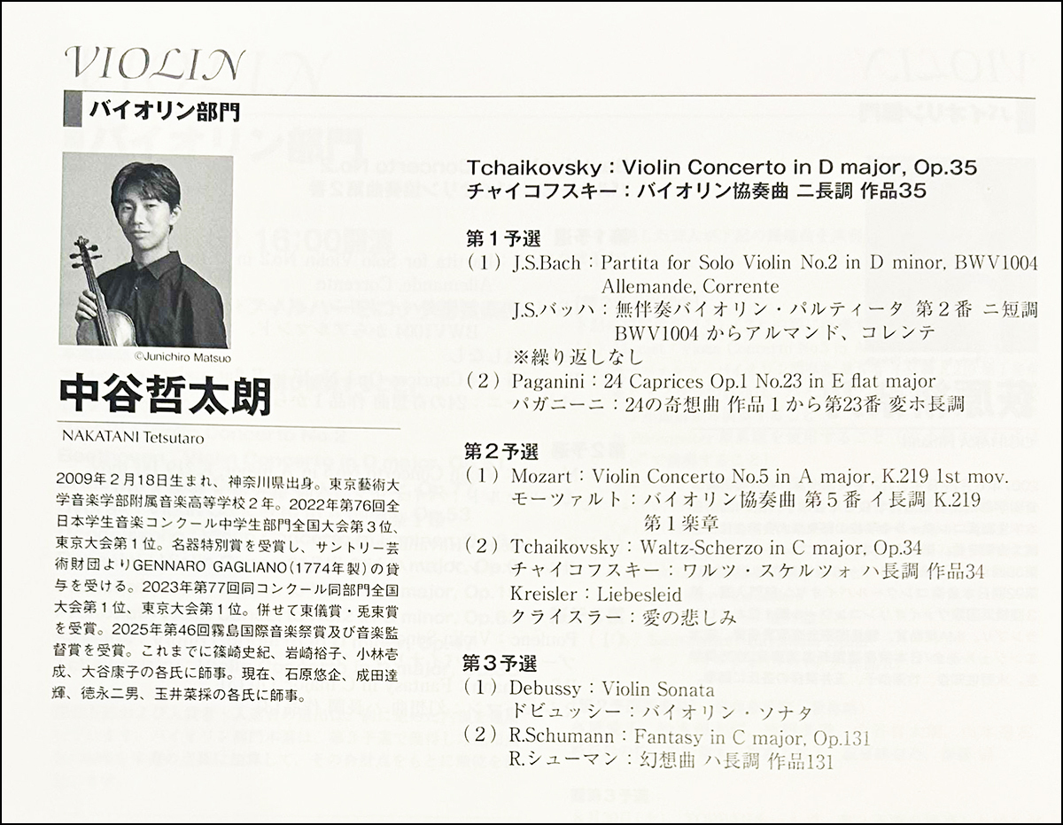 中谷さんによりますと、ご覧のような曲を第1予選、第2予選、第3予選、本選で演奏されてきたそうです。中谷さんは、プロフィールに記されている以外にも、さまざまなコンクールにこれまで挑戦されてきました。中学1年当時の全日本弦楽コンクール中学生部門でも第1位に。その時のインタビューでは、将来の夢や家族についても語っています。