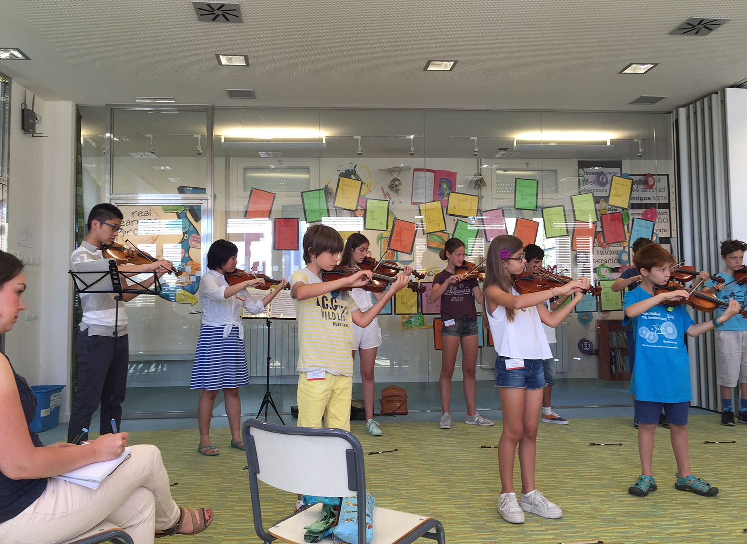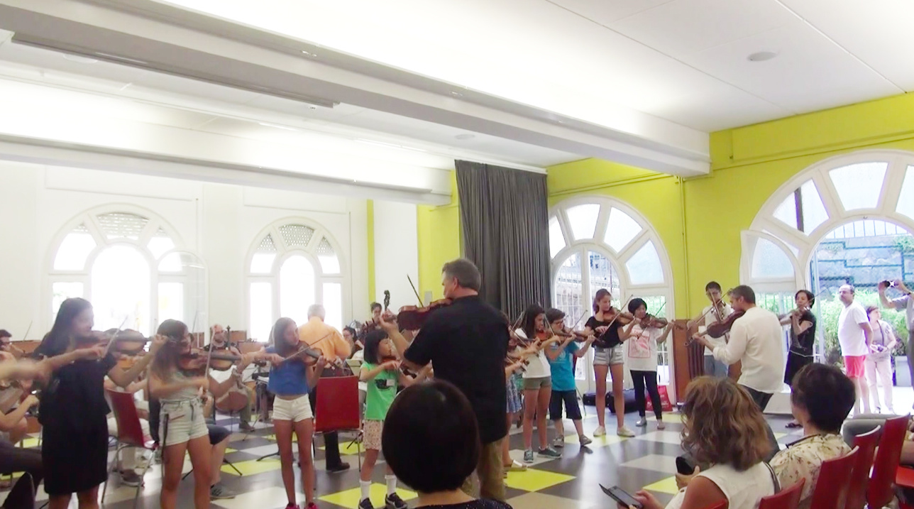 夏期学校は9時から19時。お昼に2時間のシエスタがあるとはいえ、長時間で本当に驚きました。しかし、時間ごとに入れ替わる各国の先生方のレッスンの面白いこと!!子どもたちを惹きつけてやまないレッスン。夢中で疲れを忘れて連日終了時間まで弾き続ける子どもたち、私も貴重なレッスンの様子を記録したいと握りしめたビデオを下ろすことはありませんでした。スペイン語、あるいは英語のレッスンでしたが、そんなことはまったく問題ではなく、スズキ・メソードであり、音楽であるだけで、それは共通の言語でした。