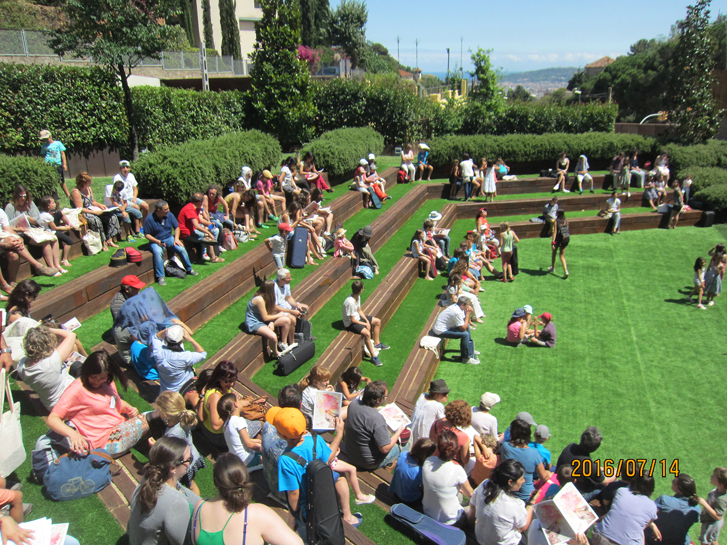 偉大な芸術家を数多く輩出したバルセロナの街は本当に美しく、どこを見回しても明るく澄んだ青空に歴史ある建築物が映え、目に飛び込んできます。特に夏期学校クライマックスの舞台となった世界遺産カタルーニャ音楽堂内部の美しさに、開いた口が塞がりませんでした。そして、その場所でのコンサートは本当に心に残る素晴らしいものでした。同じクラスで夏期学校のレッスンをともにがんばった年上の女の子たちが、出演前には娘の手を自然に引いて連れて行ってくれ、娘は満足げな笑顔で振り向いて手を振りながら楽屋へ消え、終了後には「SAKURA〜、SAKURA〜」と、かわるがわる娘を抱きしめて別れを惜しんでくれました。