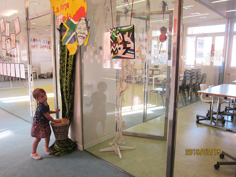 古代ローマの円形劇場を模したような形の人工芝生を敷き詰めた緑一色のかわいらしい集会場 二つ目は、メイン会場となったモンセラート学園の様子です。この学校は、聞くところでは、幼児から青年まで一貫教育を行なう私立校で、幼児教育の一つにスズキ・メソードを取り入れており、大井亜貴子先生がここで子どものヴァイオリン教育を担っておられる関係で、会場になったとのことです。近年はスペイン一の名門校として注目を浴びており、入学するのはなかなか難しいとのことでした。幼児の生徒にも芸術や科学、社会などへの偏りない関心を持たせるためか色彩豊かで、柔らかくウイットに富んだユーモラスな展示や設備があり、防音した音楽室ももちろんありました。日本では見られないこのような学校、何ともうらやましい限りです。