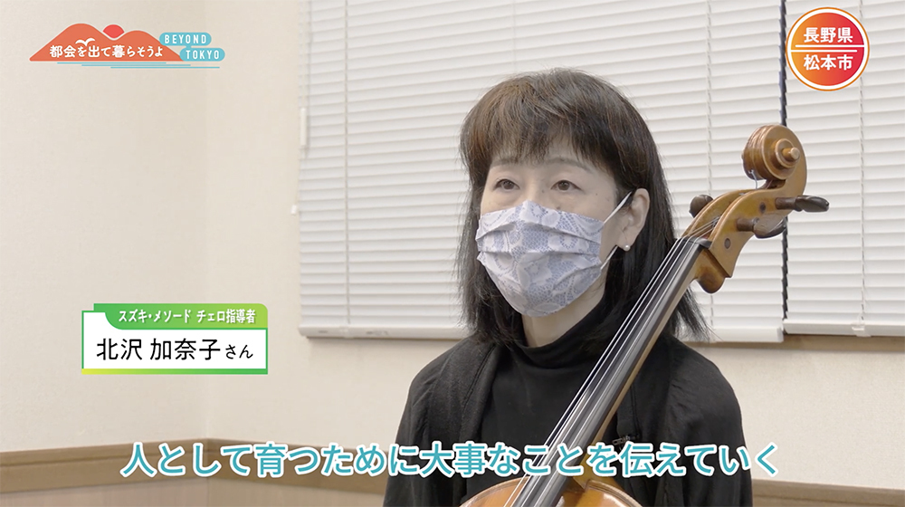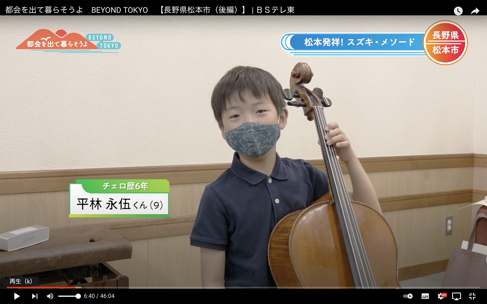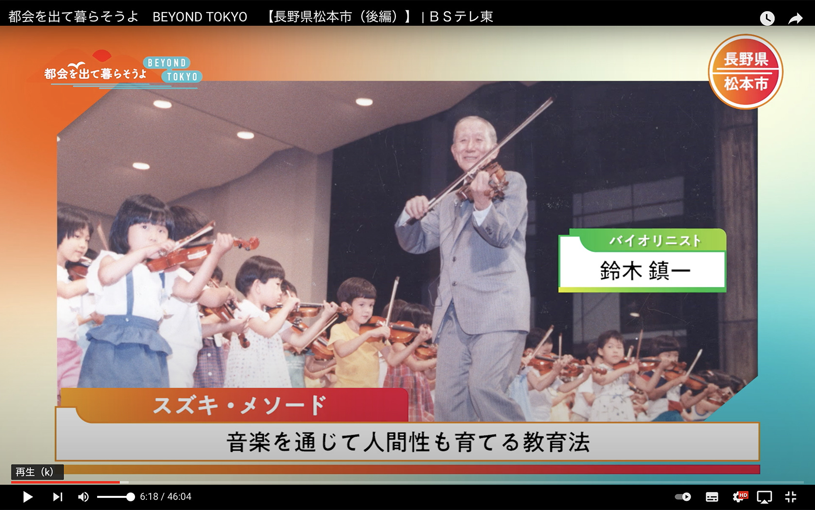 10月27日(水)22時から放送されたBSテレ東(7ch)の「都会を出て暮らそうよ BEYOND TOKYO~長野県松本市(後編)」で、スズキ・メソードが紹介されました。3分弱の放送時間ですが、要点を的確にまとめてくださっていますし、松本支部チェロ科の北沢加奈子先生クラスのレッスン風景とともに、生徒さん、お母様、そして北沢先生のインタビューを、大変興味深くご覧いただくことができます。