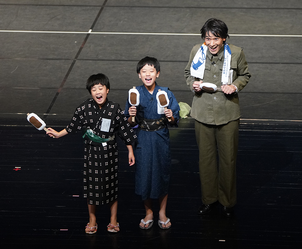 五平餅のご馳走にビックリする姿を表情豊かに演技 演出中にお願いしたのは、構図を取るための舞台の立ち位置ですが、エロキューション(語り口)・交わし合うまなざし・表情・音程・フレージング(ブレスのタイミング)・音の強弱・高低・テンポなどをしっかりとマスターしできるように指導しました。伝達技能において、話の内容10%、声30%、表情60%(メラビアンの法則)と言われるほどに大切な表情については、顔と体の向きや角度なども細かく確認をして、観客の皆様の心に届き、十分に楽しんでいただける演出を心掛けました。ちびっこ俳優たちもがんばりました。お稽古では5歳のお子様から高校生まで父兄の方々の同伴をいただき、着実に台詞と踊り、歌を覚え、大人俳優のモチベーションの起爆剤となって、本番では自然で自由闊達に楽しみながら見事に演技をしてくれました。