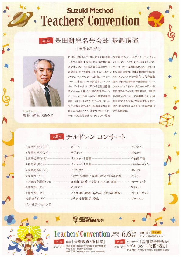 鈴木鎮一先生の教えを今の指導者や生徒たちに伝えることを日々実践されておられる豊田耕兒名誉会長による講演です。実体験ならではの貴重なお話を今年も聞くことができます。