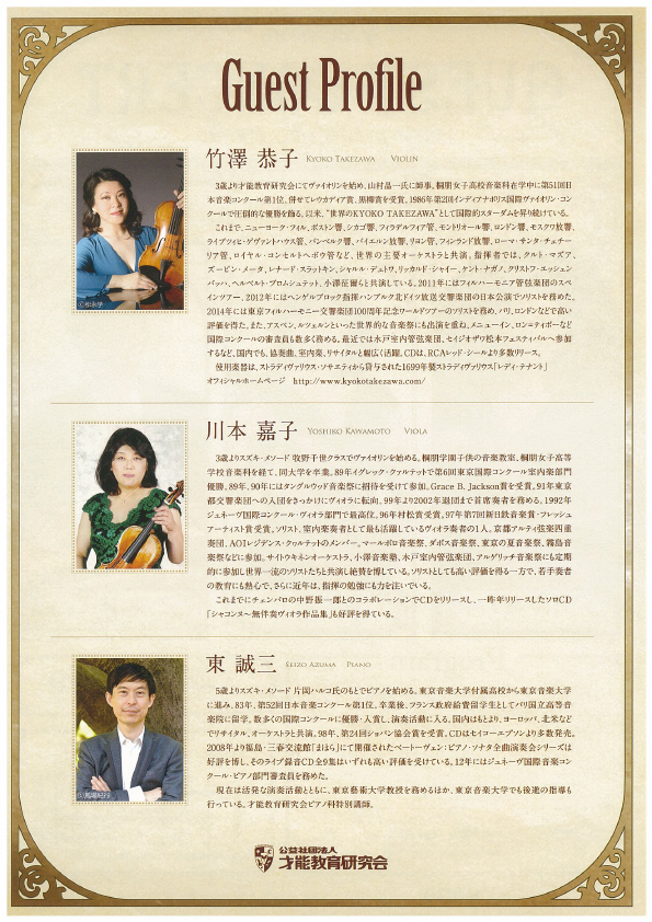 本会出身のヴァイオリニスト竹澤恭子さん、ヴィオリスト川本嘉子さん、ピアニスト東誠三さんによる豪華プログラムをお届けします。