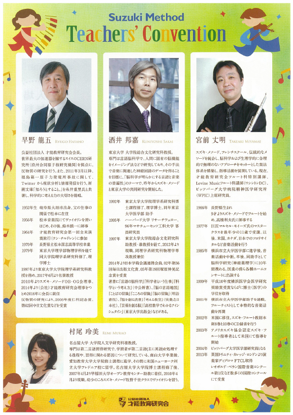 マンスリースズキでも紹介してきました東京大学と才能教育研究会の脳科学に関する共同研究の最新情報を紹介していただきながら、音楽教育の現場における脳科学の役割について、3名の皆様に、自由闊達に意見交換をしていただきます。