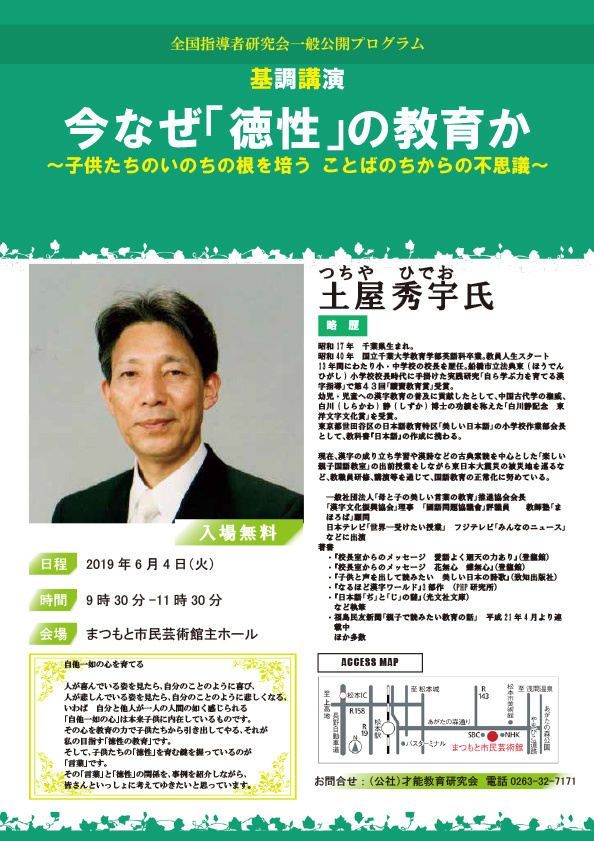 幼児の言葉の教育スペシャリストの土屋秀宇(つちやひでお)先生に「今なぜ『徳性』の教育か」〜子供たちの命の根を培う ことばのちからの不思議〜と題した基調講演をお願いしました。日本テレビ系列の人気番組「世界一受けたい授業」などに出演された土屋先生の興味深いお話を、ぜひお楽しみください。