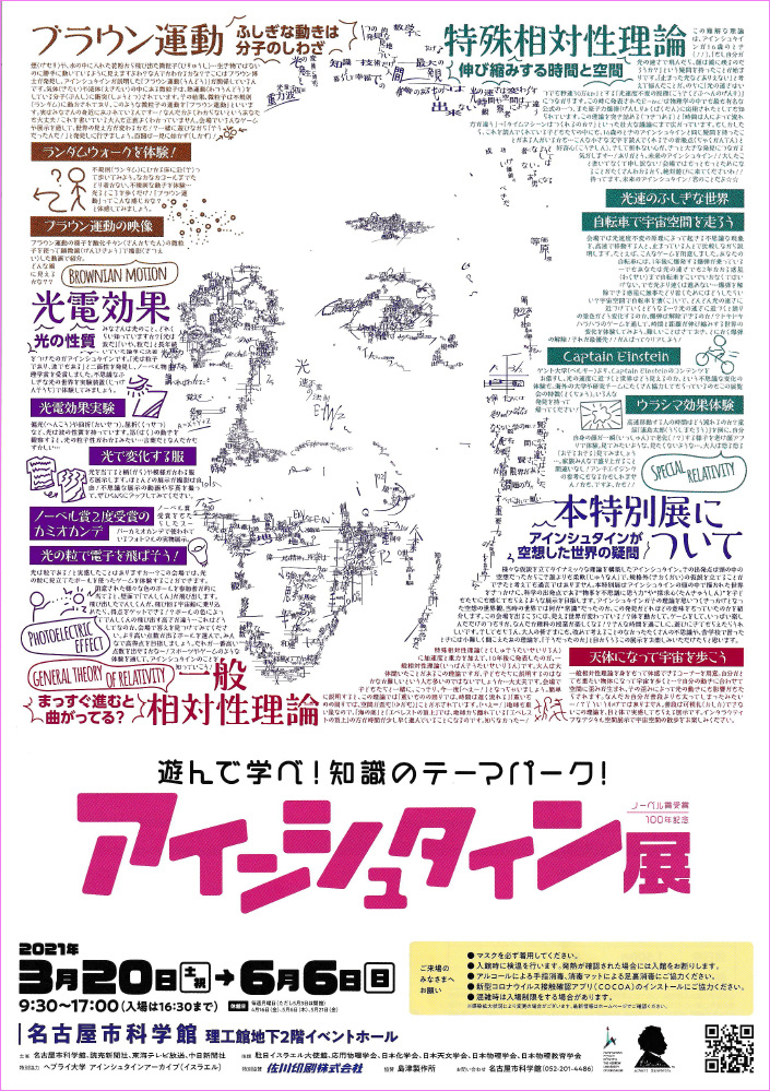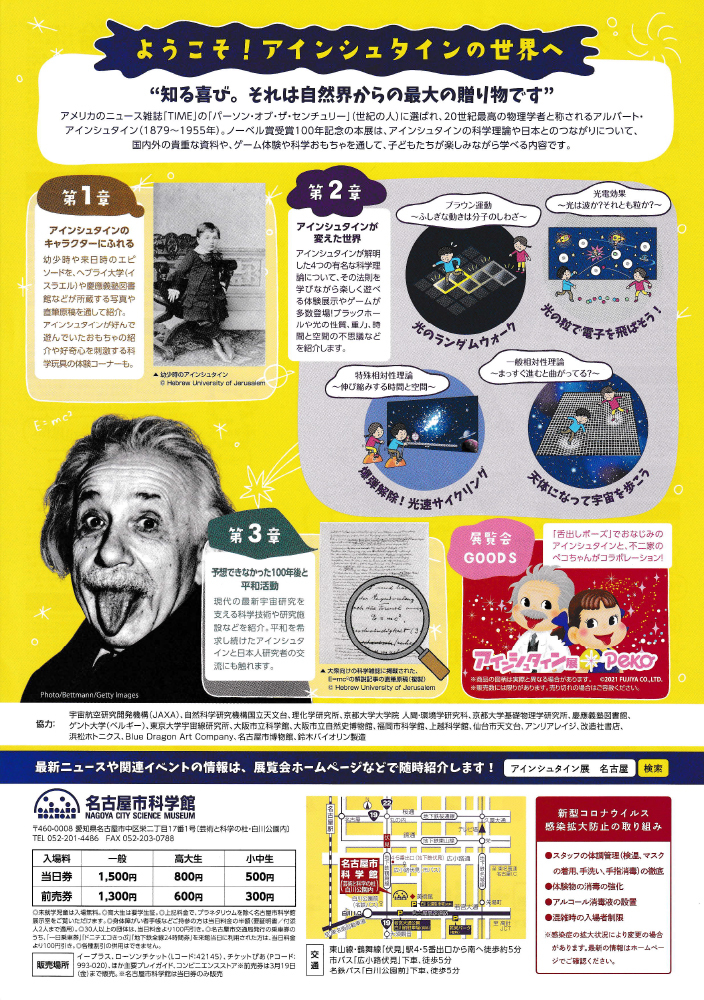 3月20日(土・祝)〜6月6日(日)まで名古屋市科学館理工館地下2階イベントホールで、「ノーベル賞受賞100年記念アインシュタイン展」が開催されています。このチラシの細かい文字を見ているだけで、壮大な仮説のもとに科学の面白さを追求したアインシュタインの横顔が見えてくるかのようで、実際の展示もとてもユニークです。一般相対性理論を身をもって体験できるコーナーや、自転車で宇宙空間を走るゲームは、ハラハラドキドキするでしょう。