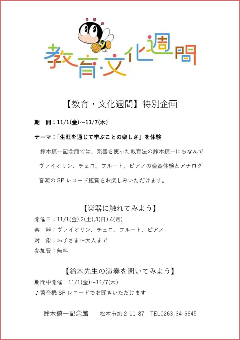 文部科学省が推進する「教育・文化週間」に呼応する形で、鈴木鎮一記念館では11月1日〜7日まで、「生涯を通じて学ぶことの楽しさ」をテーマに、楽器体験や鈴木先生の音をSPレコードで鑑賞する体験などを開催。