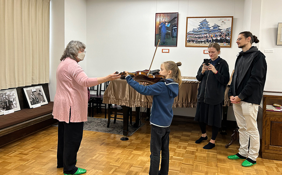 文化の日のイベントとして、鈴木鎮一記念館では11月1日から4日まで、楽器を体験してみたい人のためにチェロ、フルート、ピアノ、ヴァイオリンを試すことができる特別な機会が提供されました。ヴァイオリンの時間に、リトアニアから来た男の子とその両親が偶然、記念館に訪れました。その男の子、Gangas 君はリトアニアでヴァイオリンを学んでおり、鈴木鎮一先生について、できるだけ多くのことを学びたくてとても熱心でした。彼は、記念館内を部屋ごとに回りながら、スマホの翻訳アプリを使って資料を一生懸命読んでいました。彼は鈴木先生の父親がヴァイオリン職人であったことを知らなかったのですが、彼にはちょっと大きめである記念館にある鈴木政吉作のフルサイズヴァイオリンを弾いてみることができて、とても嬉しそうでした。