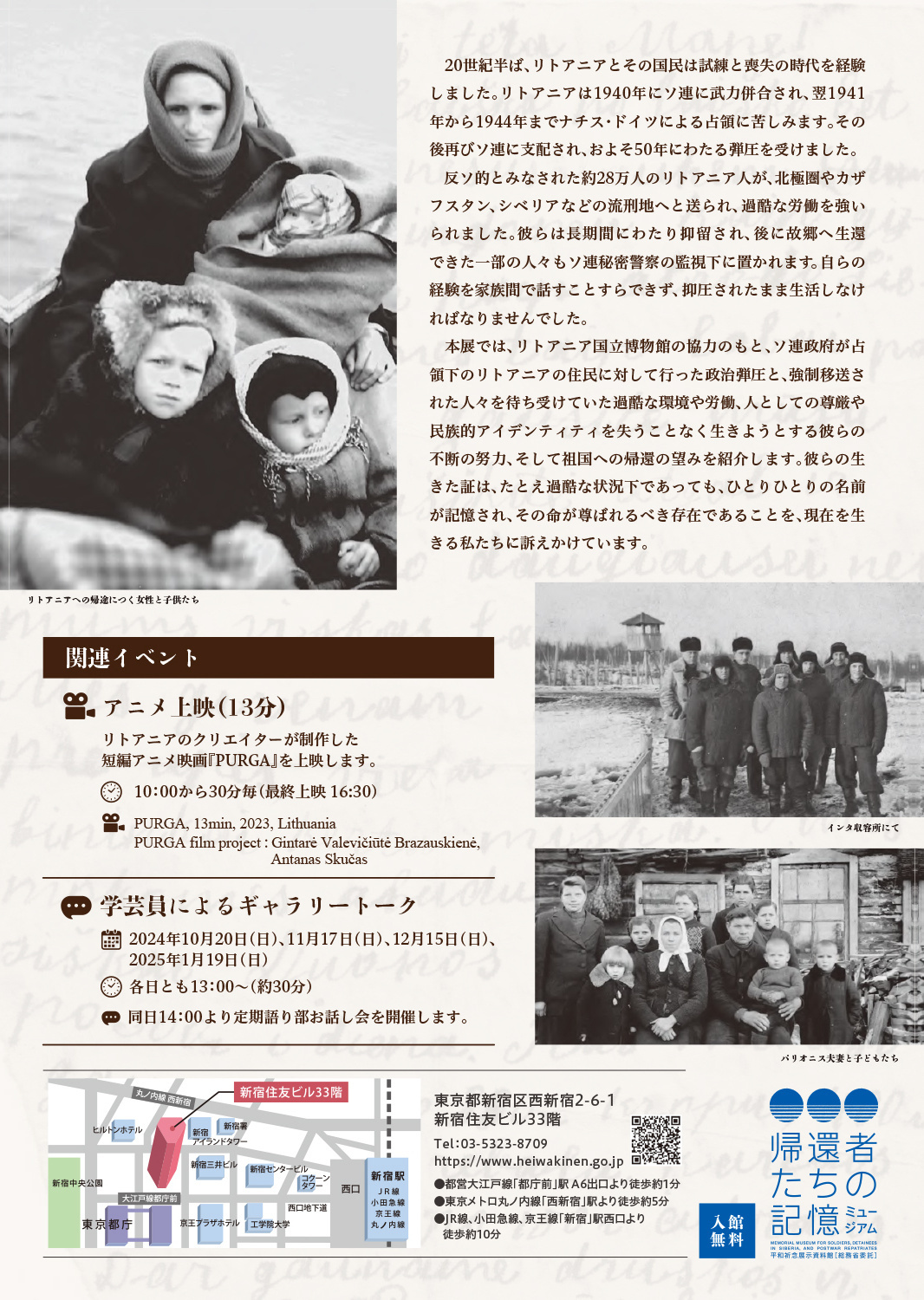 ところで、お母様のGintarėさんは、映画監督として活躍されています。今回、初来日されたのは、新宿住友ビル33階にある「帰還者たちの記憶ミュージアム」で開催中の平和祈念交流展「シベリアからの生還 リトアニア人たちの流浪物語」のオープニングセレモニーに参加するためでした。この交流展では、Gintarėさんが制作された短編アニメ『PURGA』が上映されています。