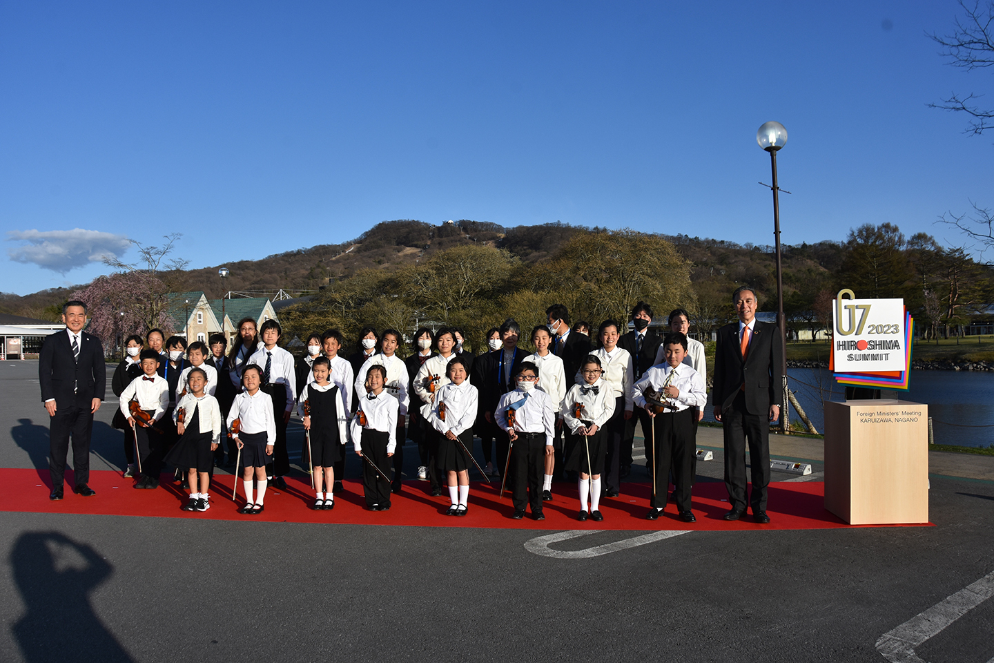 4月16日(日)にG7長野県軽井沢外務大臣会合の歓迎行事が軽井沢駅南口で行なわれ、スズキ・メソードの上田支部と小諸支部でヴァイオリンを学ぶ子どもたちが「キラキラ星変奏曲」などを演奏。おもてなし外交を重視する日本側の意向に、スズキ・メソードの子どもたちの演奏が花を添える形で、国際親善の一翼を担うことができました。