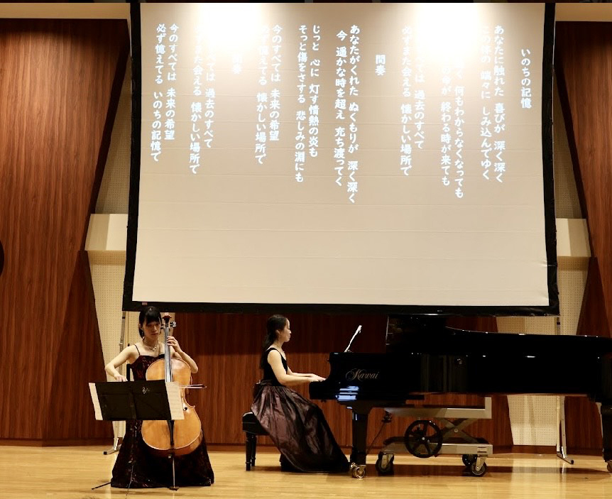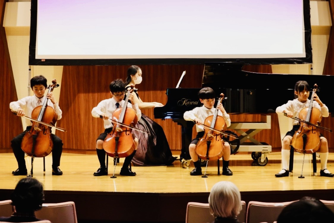 その上映会&演奏会の長野県での開催地として選ばれたのが、松本市の才能教育会館ホール。11月27日に、塚尾桃子先生(甲信地区チェロ科指導者)と嘉納尚代先生(甲信地区ピアノ科指導者)による演奏と、塚尾クラスのチェロ科生徒たちによる演奏が行なわれました。