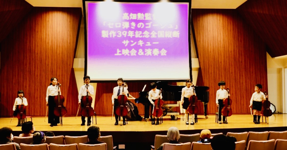 宮沢賢治原作、高畑勲監督によるアニメーション「セロ弾きのゴーシュ」の製作39周年を記念する全国縦断サンキュー上映会&演奏会が、2021年9月から12月にかけて、全国11ヵ所で開催されました。この上映会は、文化庁による「ARTS for the future!」(コロナ禍を乗り越えるための文化芸術活動の充実支援事業)に交付決定の事業として認められており、すべての会場で、映画上映とともに地元のアーティストが出演する演奏会も開催されたのが特色です。