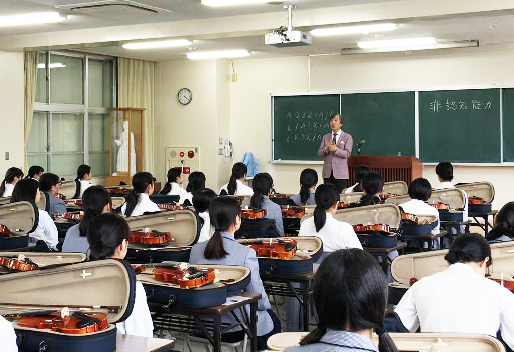 博多高等学校を運営する学校法人博多学園の八尋太郎理事長は、かつて中嶋嶺雄会長の講演を聞かれ、鈴木鎮一先生の著作「愛に生きる」にも大きな感動を得られたことをきっかけに、才能教育研究会との交流が生まれました。鈴木裕子会長の時代に、博多学園が運営する7つの幼稚園で、スズキ・メソードでのヴァイオリンレッスンの展開を検討したこともありました。その後、心のケアを学ぶ博多高等学校看護科の生徒さんを対象に、スズキを取り入れることで「感性を育てたい」ということになり、2013年4月に、看護科の1年生を対象にヴァイオリンの授業が正式にカリキュラムに組み込まれました。