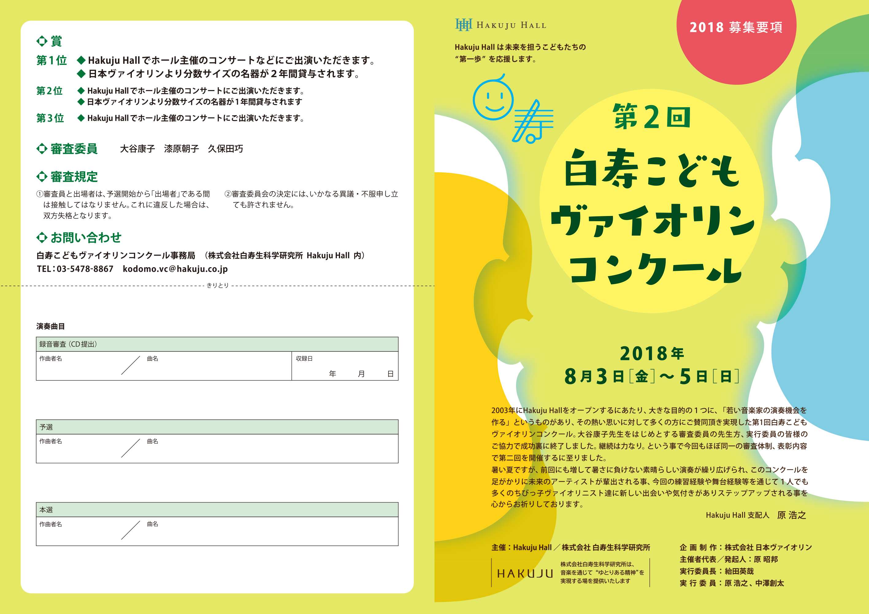 「若い音楽家の演奏機会を作る」ことを目的の一つとしてオープンした東京代々木のHakuju Hallが、2016年8月よりスタートしたのが「白寿こどもヴァイオリンコンクール」。小学1年生と2年生を対象にしたカテゴリー1と、小学3年生と4年生を対象にしたカテゴリー2があります。