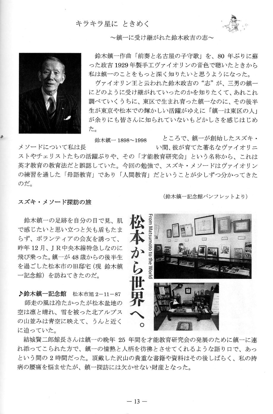 名古屋の「東区文化のみちガイドボランティアの会」では、会報誌「東区文化のみちあれこれ」を発行されています。最近、同誌に東区に生まれた偉人である鈴木政吉と三男の鎮一について、松本の鈴木鎮一記念館や地元のチェロ教室を丹念に訪ねた成果が掲載されました。著者の甲斐健士さんのご好意で、掲載させていただきます。