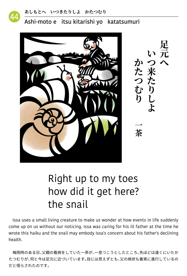 一茶の俳句の美しさを英語化する場合、それも広く英語圏に日本の文化を紹介する目的を持つ場合、あるいは日本人に英語との親和性を持ってもらう目的の場合には、Haikuを創作する場合とはまったく異なった考え方が必要です。一茶の俳句の心を、両方の文化圏で生まれ育った視点とスズキ・メソードの中で子どもの頃抱いた思いから解釈することは自然の流れでしたが、それを英語でHaikuとして表現することの課題などは、別の機会に説明します。