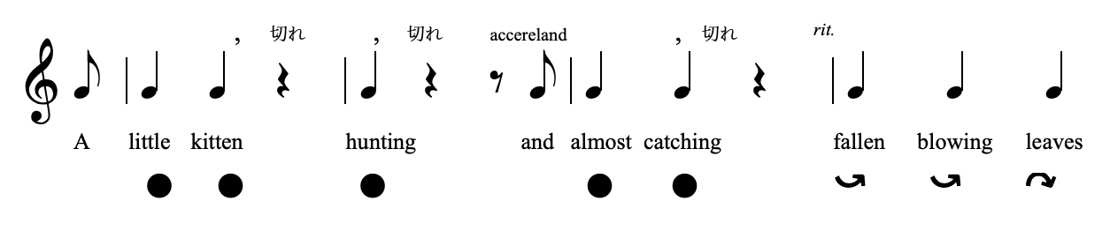 明らかに、5・7・5のリズムでは詠っていません。このリズムは確かに存在するのですが、潜んでいることになります。不定冠詞のAはアウフタクトであり、楽譜にすると3拍子のようです。ただし、休符のところは進んで行く拍ではなく、止め(切れ)のように感じられます。通常の英文ならば主語の後に動詞が置かれてA little kitten tries to huntのように続くでしょう。しかし、英訳俳句はA little kittenの後に動詞が続いていません。そこで途切れたような感じです。途切れて1拍分の間をとり、いきなりhuntingと始まります。これは動名詞というより現在進行形 “is hunting”のbe動詞が省かれたような感じがします。猫の子が今動いているイメージです。パックンが実に上手くその動きを表現しているのですが、朗唱(演奏)のリズムは私の意表を突くものでした。little kittenはそれぞれ「2シラブル1ワード」に1拍が割り当てられていたのですが、huntingは同じ「2シラブル1ワード」でありながら、休符も含めて2拍半も間をとっているのです。そしてandをアウフタクトのようにして急き込むようにalmost に飛び込み、catchingで止まります。パックンはこの後、息を深く吸ってテンポを落とし、緩やかにfallen, blowingと抑揚を上に回すようにしています。木の葉の舞い落ちる様子を声で描いたのでしょう。最後は上がった抑揚から落ちるようにleavesで締めくくられています。旋律はありませんが、実に音楽のような演奏(朗唱)です。