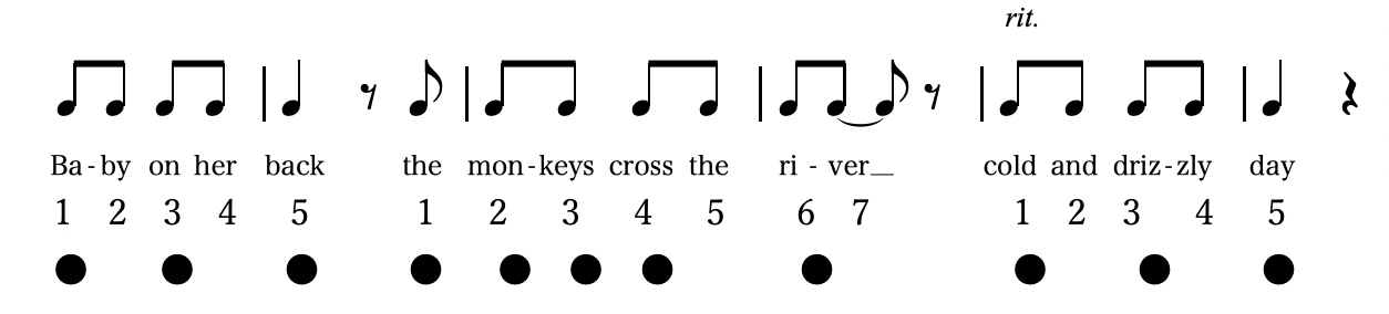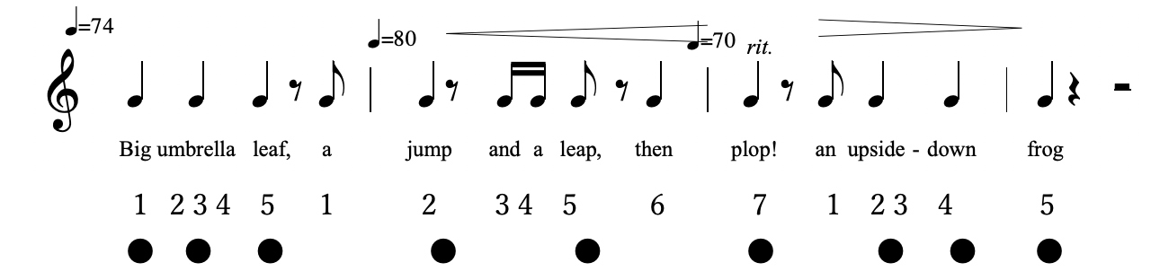 さて、パックンの方はどう演奏(朗唱)しているでしょう。私はネイティブの英語スピーカーではありませんから、英訳された俳句を示されてもどういうリズムで音読すればよいかがわかりません。たとえば、第1番の “A little kitten”(猫の子の・・・)は俳句の5・7・5のリズムを英語のシラブルに適用しています。詳しくは後ほど述べますが、英訳は実に見事です。しかし、フランス語やイタリア語のようなsyllable-timed rhythm (シラブル間をほぼ等間隔に発音するリズム)と違って英語はストレスのある間隔(Foot)を等しくとるstress-timed rhythmです。果たして、パックンはシラブルを等間隔にした5・7・5のリズムで朗唱するのでしょうか。それとも、読むときには英語のリズムを優先するのでしょうか。ワクワクしながら聴いてみました。正確ではありませんが、パックンが詠んだリズムを楽譜にするとほぼ次のようになります。