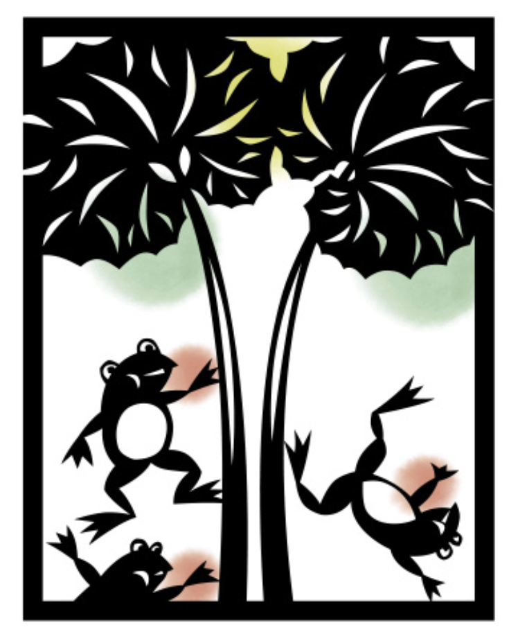 第2番のBig umbrella leaf (蕗の葉に・・)も5・7・5のシラブルリズムで作られていますが、パックンの朗唱は第1番とよく似ています。これに対し、5・7・5シラブルで作られ、朗唱においてもこのリズムが良く合っているような句があります。これについては、英訳の問題と深く関わってきますので後で論ずることにいたしましょう。その前に、本書のもう一つの素晴らしい特徴、切り絵とイラストについて述べておきたいと思います。