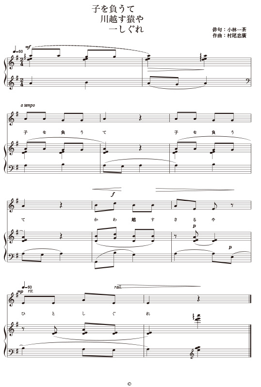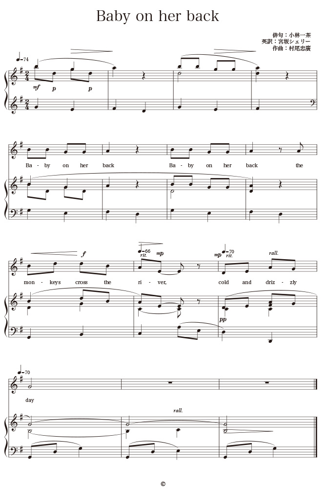 第1番、2番の5・7・5シラブル英訳俳句は、英語の強勢拍リズムで詠んだものでしたが、本書に収められたものの中には音節拍リズムで詠んでも面白いものがあります。その例としてBaby on her back(子を負うて・・・)を取り上げてみましょう。パックンはほぼ次のように等拍音節に近いリズムで詠んでいます。(ただし、coldは長めに、andは短くしている)