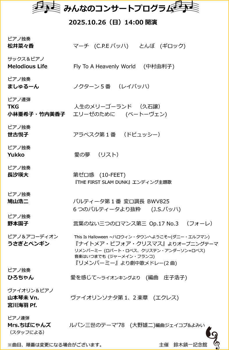 10月26日(日)に鈴木鎮一記念館で開催された「第10回みんなのコンサート」について、記念館の中澤由季子様から概要をお知らせいただきましたので、ご紹介しましょう。