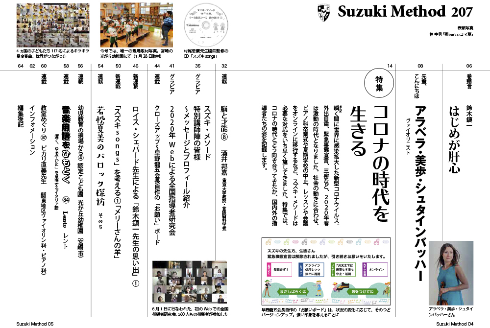 未曾有の感染拡大に対し、スズキ・メソードがどのように対策を講じ、指導者がどんな思いで再開への道のりを歩み出したか、特集で伝えました。保護者の皆さんと相談し、生徒さんに寄り添う中で、試行錯誤しながらも、逆境に負けぬ強い意気込みを感じられました。「鈴木鎮一先生だったらどうしただろう?」は、大きな牽引力でした。取材対象は海外にも広がりました。