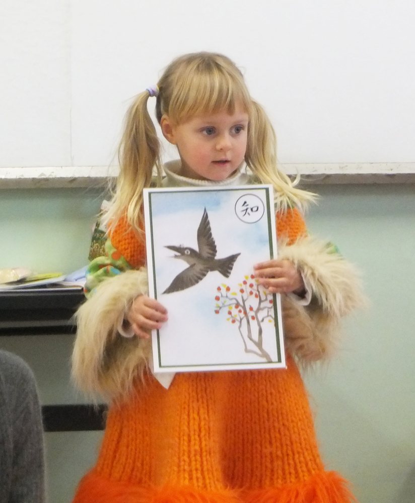 俳句に挑戦中のマータちゃん 俳句がとてもユニークです。1ヵ月で10句くらい覚えていました。頭が柔らかいこの時期にいいと思います。「ママ、俳句で遊ぼう」と五七五でオリジナルを作るようにもなりました。お母さん教室も、とても楽しめました。嬉しかったのは、その時間に子どもたちがママたちの邪魔をしなくなったことです。いろいろな楽器の生演奏が聴けたことも素晴らしい体験でした。