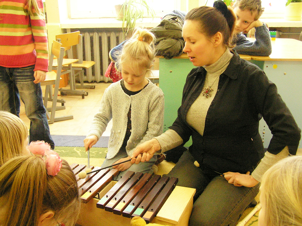 音楽の授業を行なう校長のDeja先生 カウナス市のスズキ小学校は毎日、イベントで溢れています。幼稚園の子どもたちは1日に4時間幼稚園で過ごします。小学生は5時間授業を受けます。学校は朝7時に門が開きます。授業は8時30分から始まりますが、スズキで楽器を学んでいる生徒は7時45分からレッスンを受けています。他の子どもたちはホールでピアノを弾いたり、友だちと遊んだりするために、早くから学校にやってきます。先生や事務局員は8時前後に出勤してきます。