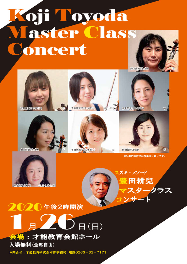 1月26日(日)、才能教育会館ホールで豊田耕兒先生によるマスタークラスコンサートが開催されます。すでにたくさんの生徒さんを育てている現役指導者たちが、さらに自らの研鑽を積むために参加されるマスタークラスです。先生たちの奮闘努力の姿をご覧になりませんか?