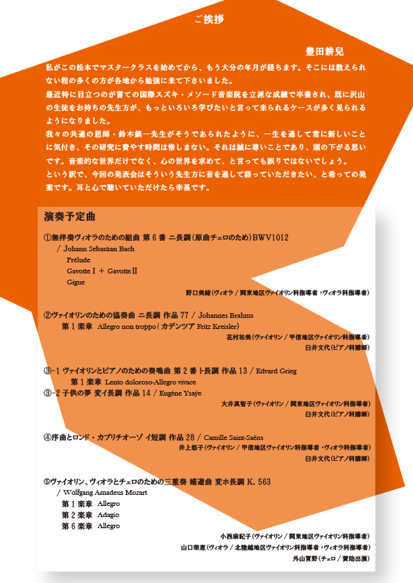 我々の共通の恩師・鈴木鎮一先生がそうであられたように、一生を通して常に新しいことに気づき、その研究に費やす時間は惜しまない。それは誠に尊いことであり、頭の下がる思いです。音楽的な世界だけでなく、心の世界を求めて、と言っても誤りではないでしょう。