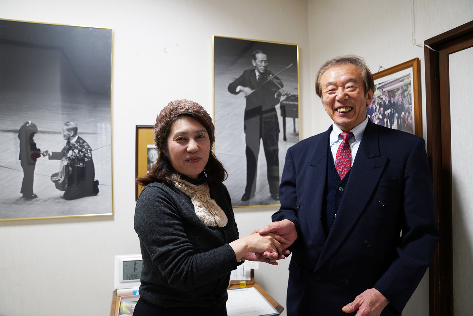 等々力由季子さんと結城賢二郎館長 私は、才能教育研究会で33年間仕事をさせていただき、その後、鈴木鎮一記念館に約10年間勤め、「人生の半分を鈴木鎮一先生のために」との思いで仕事をしてまいりました。振り返ってみますと、幼少の頃より私はたえず鈴木先生に見守られていたのだと、つくづく実感いたしますし、感謝の気持ちで一杯です。