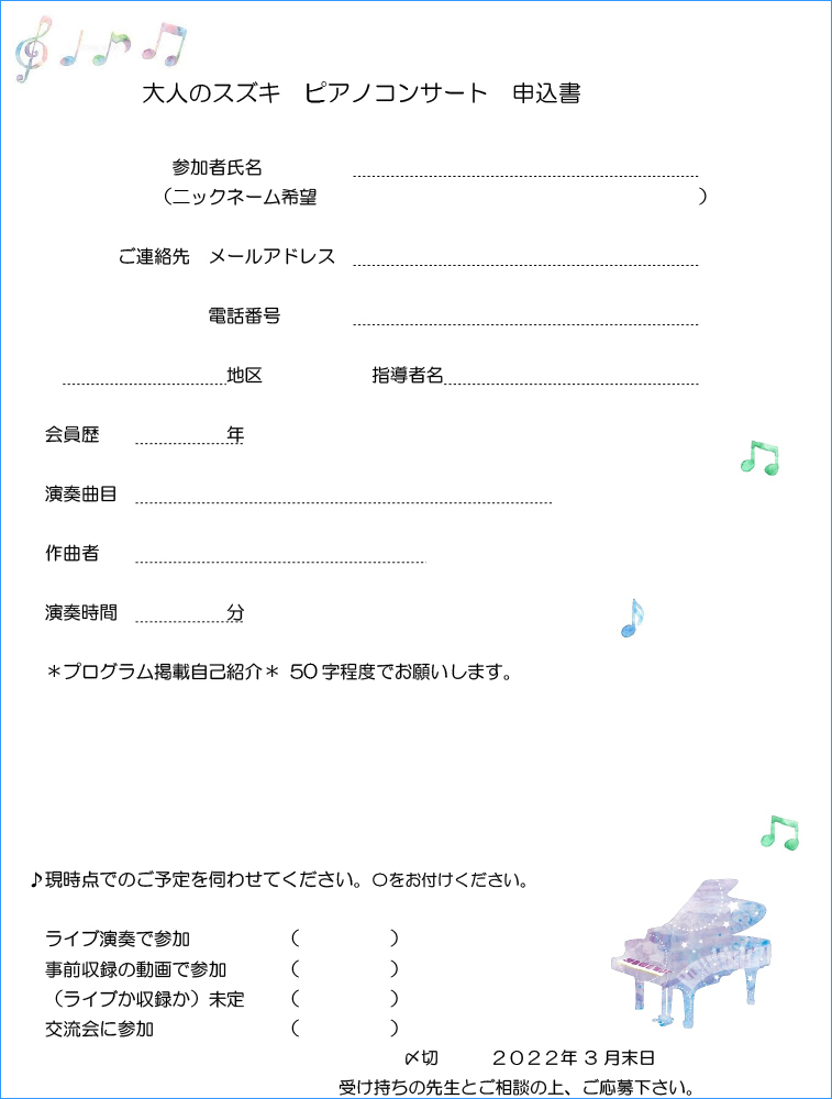 ・演奏曲は、スズキ・メソードの指導曲集から選択。もしくは5分程度の曲。