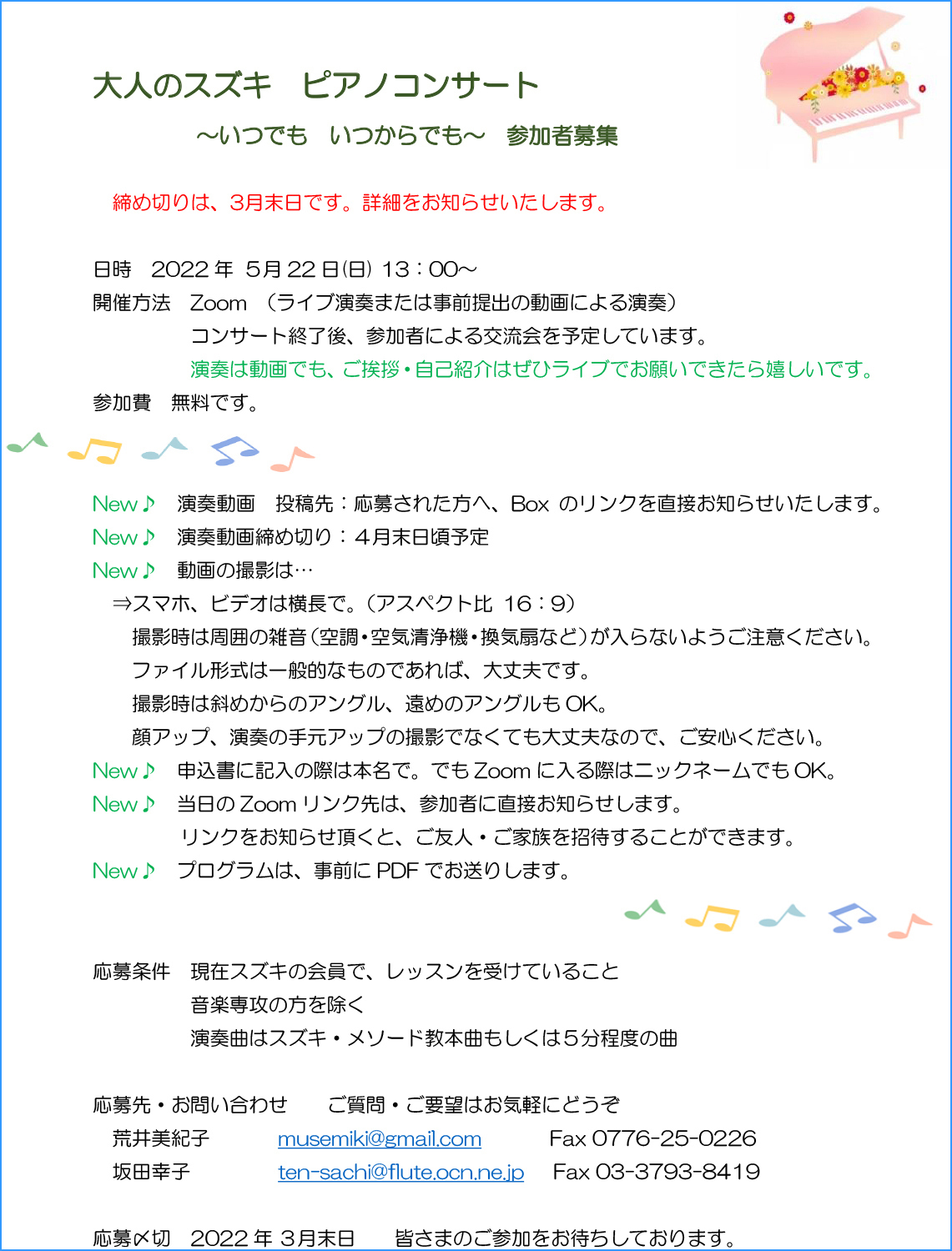 5月22日(日)にZoomによるライブ演奏もしくは事前提出の動画によるコンサートで、終了後には交流会もあります。