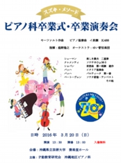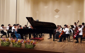 15年間ずっとオーケストラでお世話になっている沖縄県立芸術大学、庭野隆之教授にサポートしていただき、大学内の「奏楽堂ホール」にて卒業演奏会を開催することができました。スズキ・メソードの卒業制度のお陰で、ほぼ毎年ピアノ協奏曲は、教授のご指導のもと、県立芸術大学や琉球大学の学生、沖縄フィルハーモニー管弦楽団、