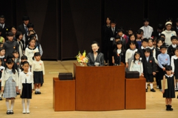 代表生徒による証書授与 卒業式典では、鈴木裕子会長をお迎えして、前期初等科から研究科Bまで卒業生全員が登壇し、一人ひとり名前を呼ばれ、各科代表生徒に鈴木会長より卒業証書が授与されました。鈴木会長の先導で「どの子も育つ」の元気な声が響き渡り、会場が温かい雰囲気で包まれました。