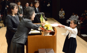 鈴木裕子会長から証書を授与いただき、緊張のなかにも笑顔がこぼれます