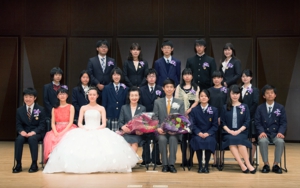 今回はホールのパイプオルガン下にあるポディウム席にも卒業生が着席して式典に臨みました また、「キラキラ星変奏曲」の録音申請をしたプレ卒業生の紹介に始まった卒業式典では、ホールのポディウム席を利用して、出席の卒業生全員が臨場感ある式典になりました。そのなかで研究科B卒業生からは、舞台上で保護者にお花のプレゼントもあり、これまでの感謝の気持ちを伝えることができました。