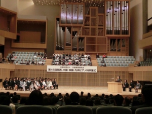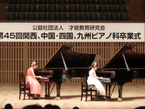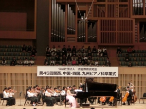 ピアノ協奏曲K.414の演奏で華やかな幕開けです 関西、中国・四国、九州地区ピアノ科卒業式は、関西でも有数の音楽ホールである京都コンサートホールの大ホールでの開催となりました。恒例のモーツァルトのピアノ協奏曲 第12番 イ長調 K.414の演奏に始まり、卒業式典、その後の代表生徒による2台のピアノやソロの卒業演奏、最後に皆での合奏演奏と、充実した一日でした。