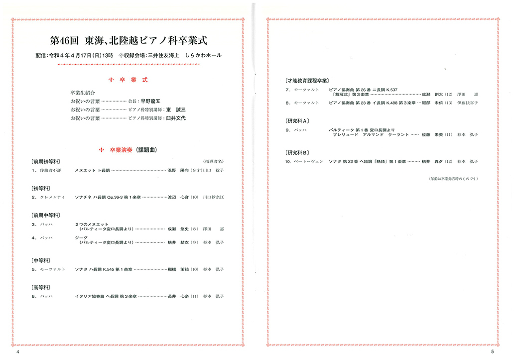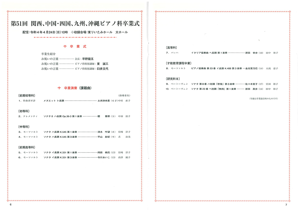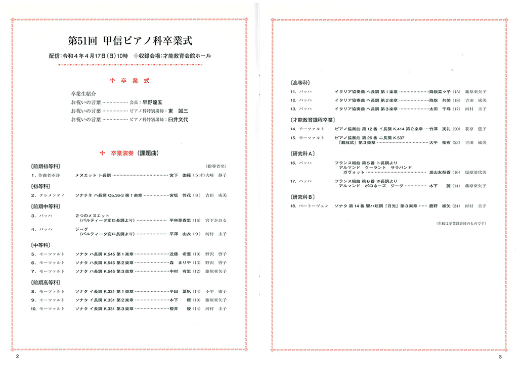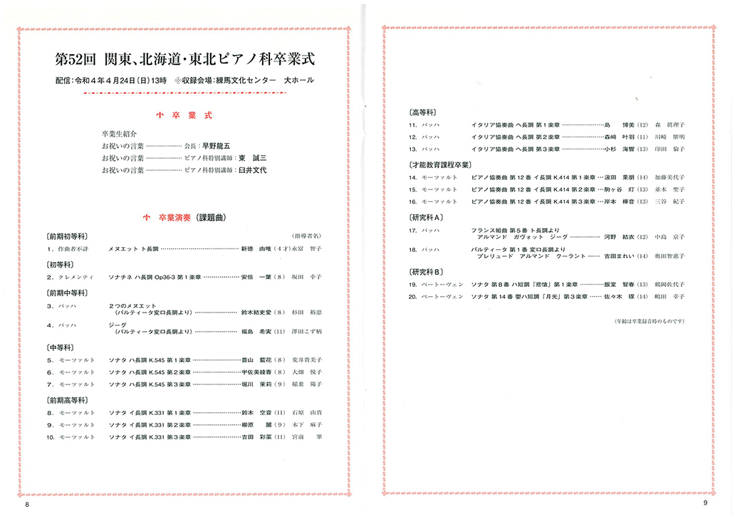 | 2022ピアノ科卒業式・卒業演奏会 オンライン配信スケジュール | ||